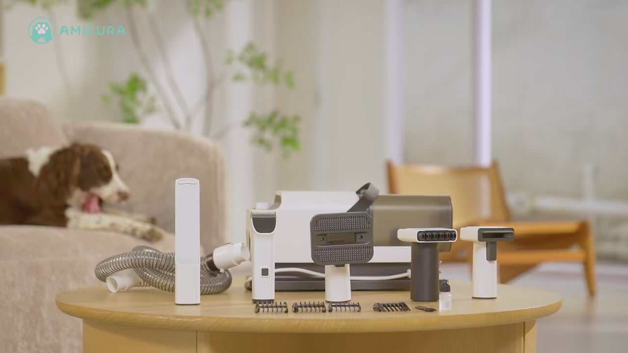 The Amicura P1 is an all-in-one grooming system that trims, dries, and vacuums pet hair at the same time, keeping your space clean while giving your pet a stress-free grooming experience.